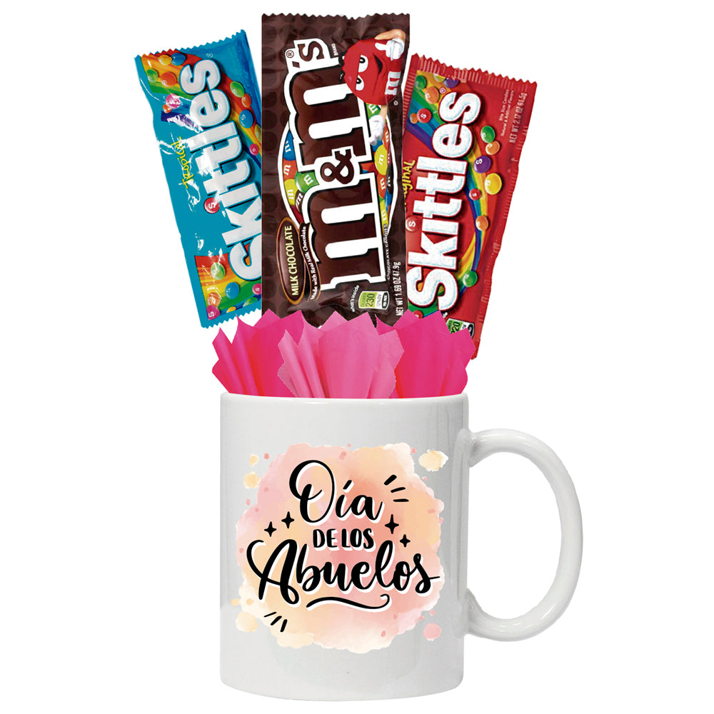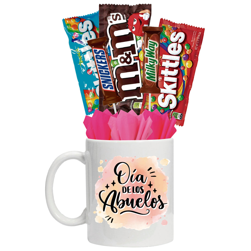 - Paquete 3: 1 taza 11 oz, 3 chocolates y 2 dulces.