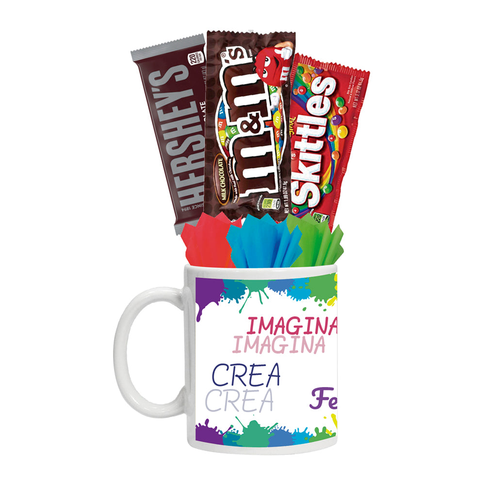 - Paquete 3: 1 taza 11 oz, 3 chocolates y 2 dulces.