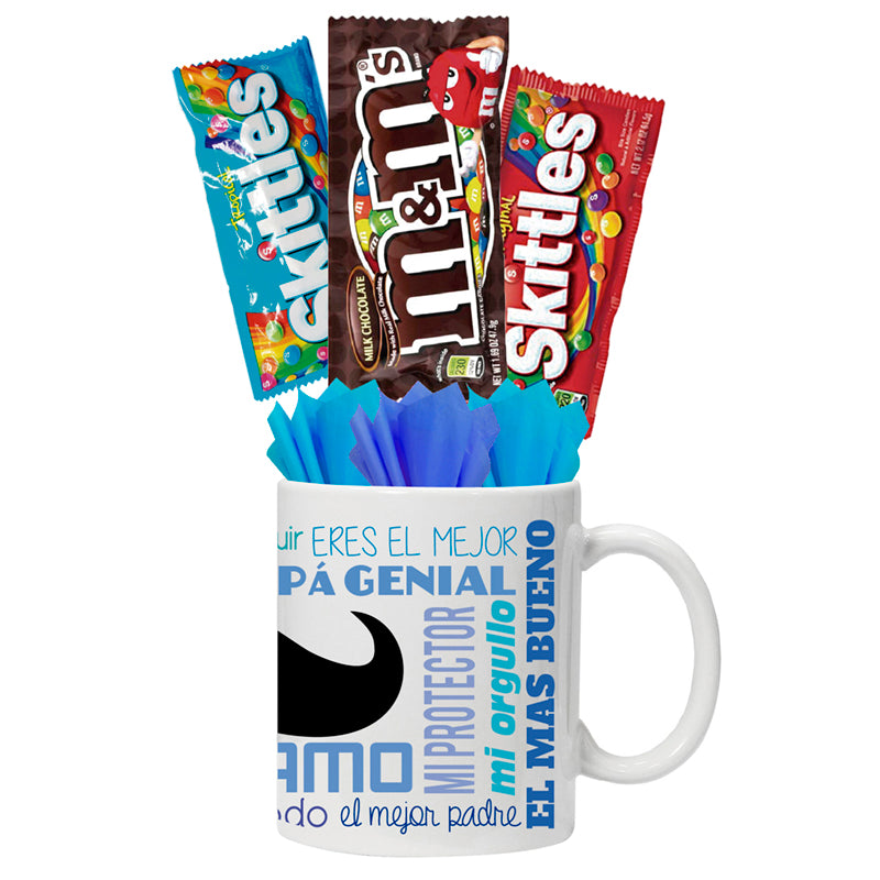- Paquete 3: 1 taza 11 oz, 3 chocolates y 2 dulces.