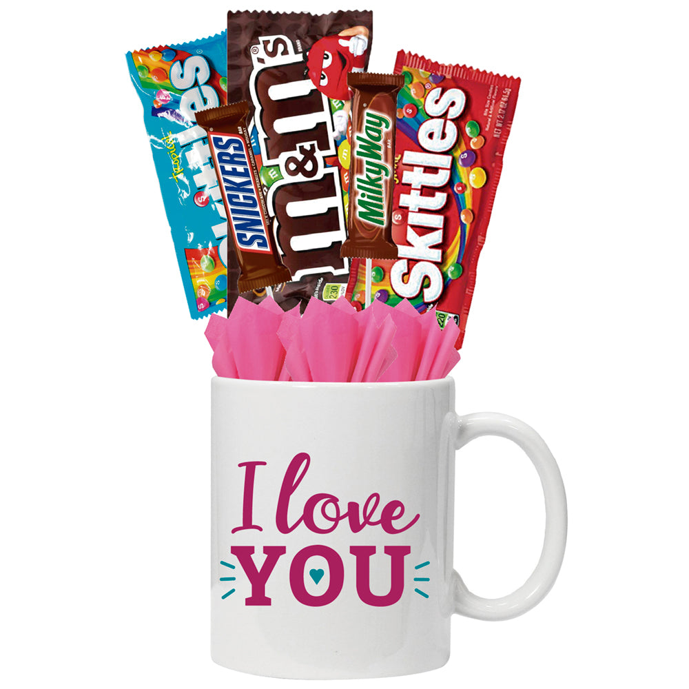 - Paquete 3: 1 taza 11 oz, 3 chocolates y 2 dulces.