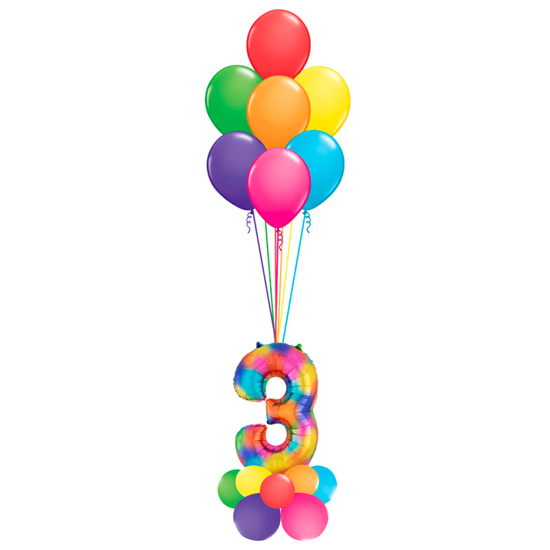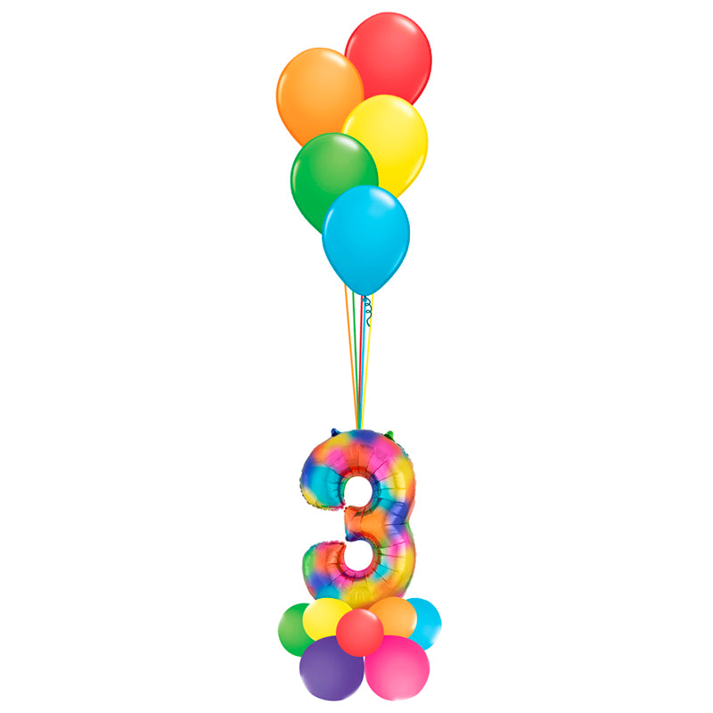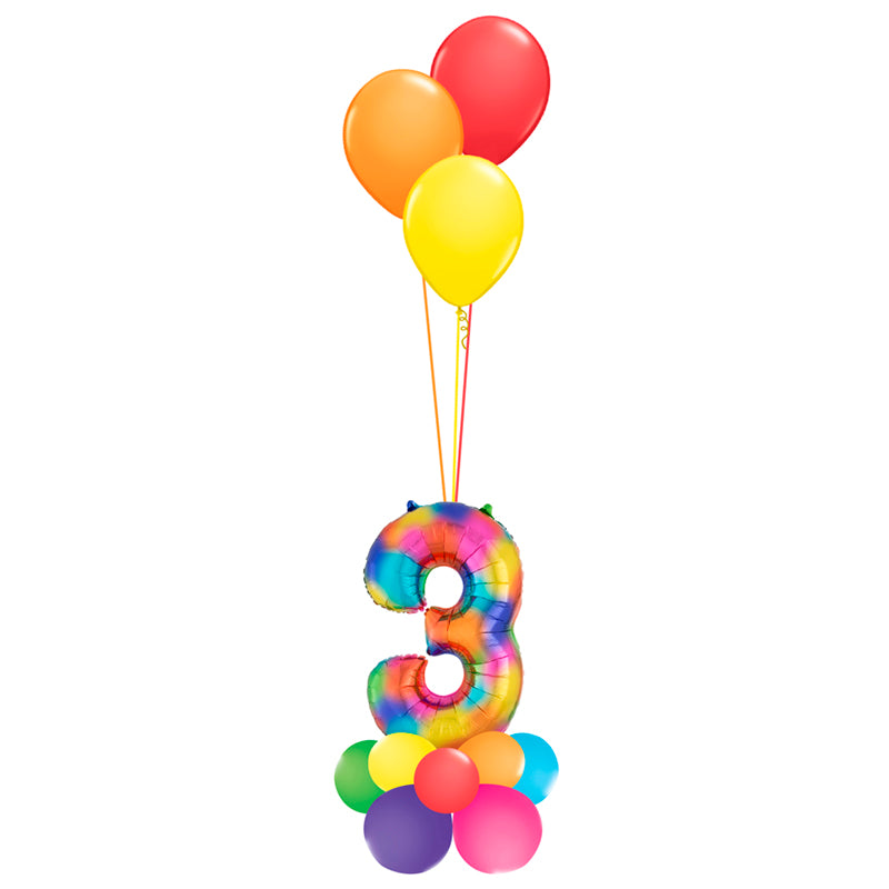 - Modelo 1: 3 globos de látex, número metálico de 34" y base de globos (5 látex de 11" y 5 látex de 5").